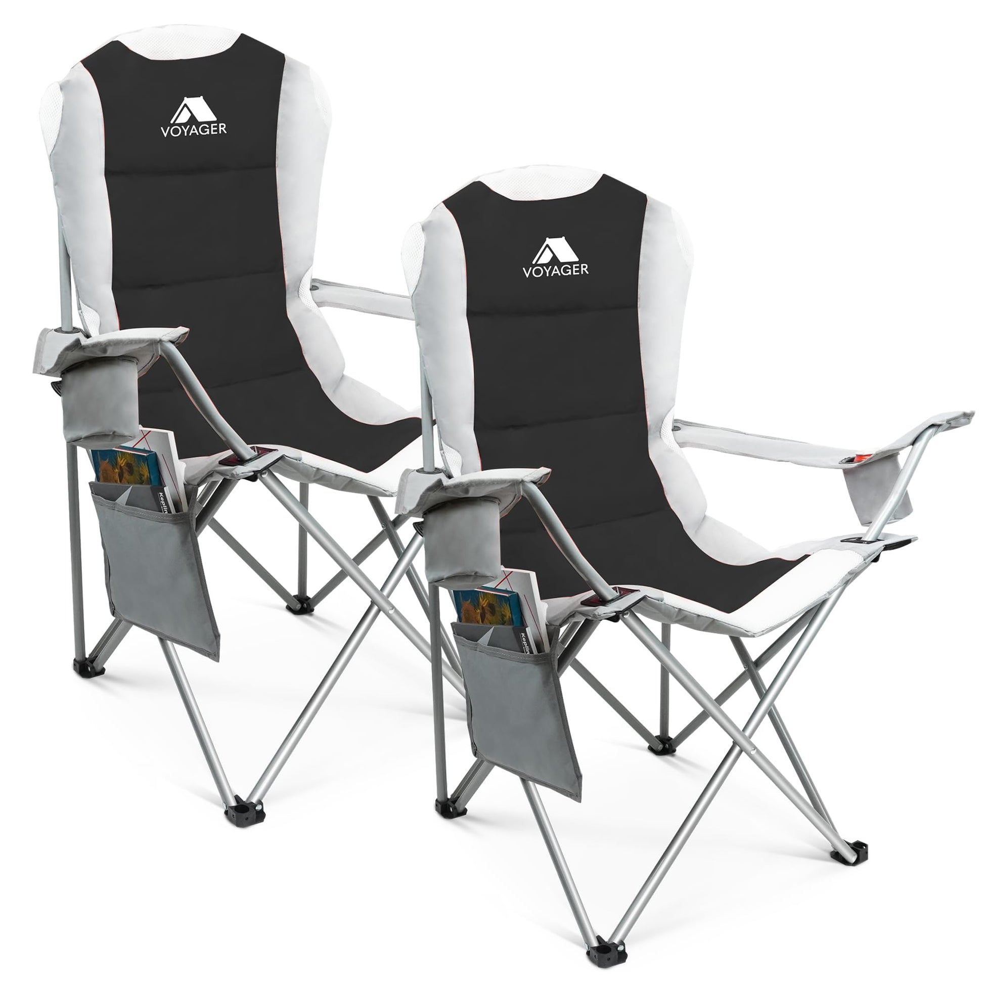 Voyager Set Of 2 Premium Padded Camping Chairs Lightweight & Foldable with Cup Holder & Side Pockets Ideal Water Resistant Outdoor Seats for Garden,Fishing,Picnic,Camping & Travel Heavy Duty (Black)
